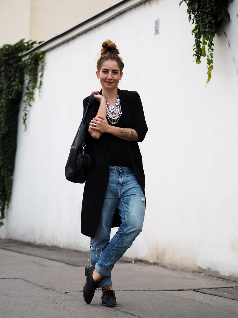 No a v druhé řadě je tu fakt, že i když přispívám obden (což je přece strašně často!), tak mám v zásobě fotky třeba měsíc staré a postupně je pořád oddaluju a oddaluju, protože o těch nových se mi chce psát vždycky dřív. Takže pozor, než i tenhle outfitovej post upadne v zapomnění, Vám musím ukázat, co jsem měla na sobě na večeři s holkama z CzechChicks. Ještě se dalo jít ve vrhnutém rukávu a člověk byl ok, což se teď několik měsíců nepoštěstí, takže je mi z těch fotek trochu smutno. Nicméně hlavním prvkem je samozřejmě náhrdelník, kterému by se až hodil přívlastek šokující. Nic tak velkýho, těžkýho a blyštivýho jsem před ním doma neměla. Proto jsem se i na jeho kombinování pustila velice opatrně a jednoduše - boyfriendy a zbytek černejch jednoduchej. A drdol - na kterej mám bájdwej už natočenej tutorial, takže až ho sestříhám, tak konečně uvidíte to, co vás tak zajímá - protože jedině s ním ten náhrdelník vynikne opravdu přesně tak, jak má. Co vy na to? Je to příjemná změna nebo ho mám zas nechat dlouho uklizenej? :D